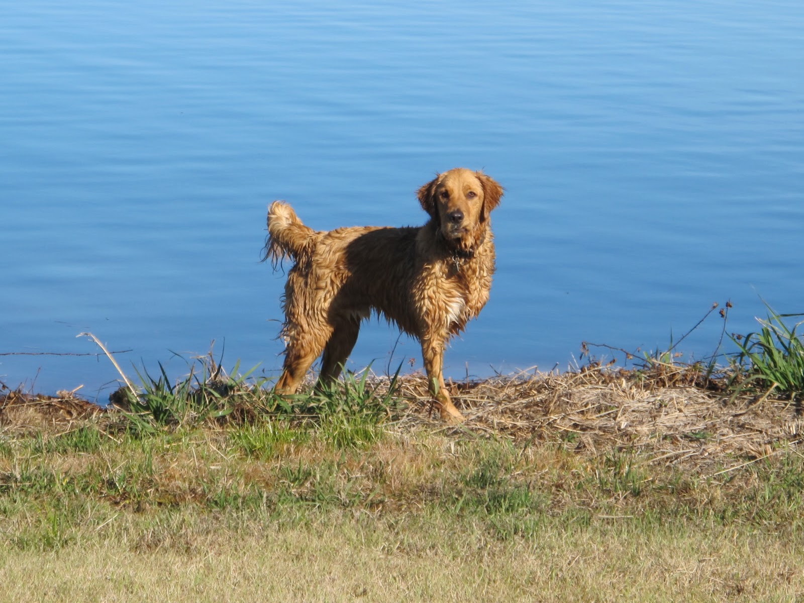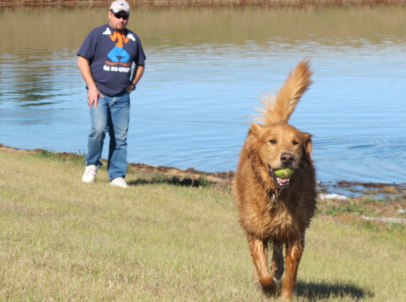 Then there was the day that mom and dad had a brush with the law. For whatever reason, I was left behind and Scarlet and Kudzu were taken to our favorite swim hole five miles from our house. It's where we always go (90% of the pictures of us doggies near water were taken there). As normal for such an outing mom had a throw toy tossing it into the lake for Scarlet and Kudzu to retrieve. Since there were NO OTHER HUMANS ANYWHERE around, mom had no problem allowing them to roam freely. And they were having a blast.
